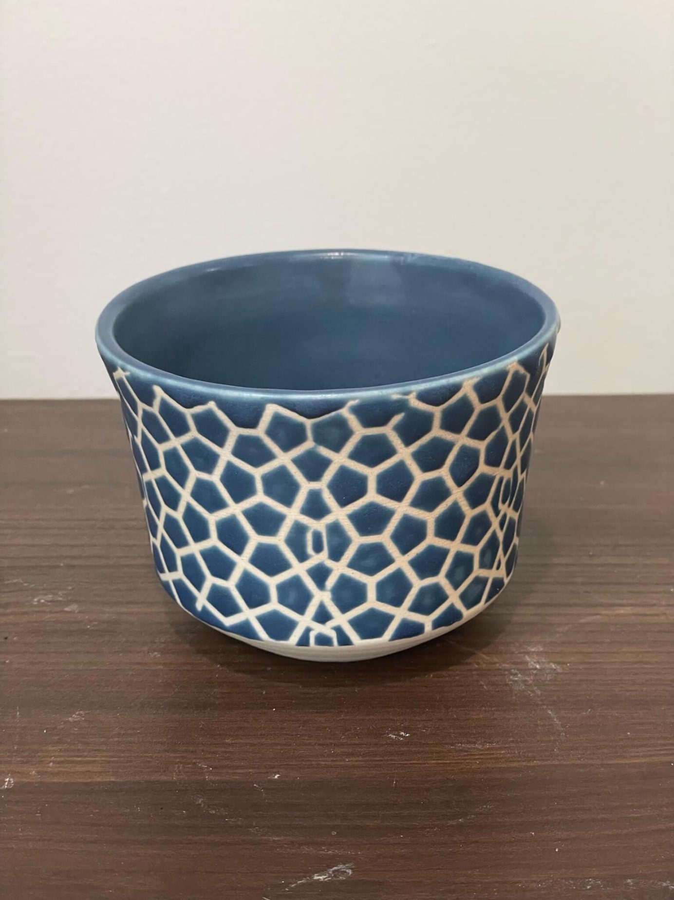 A small planter pot thrown in porcelain. Then I designed a hexagon pattern on the computer, used a cutting machine to cut out the pattern and then applied it to the pot. Then glazed it and removed the vinyl to reveal the pattern.