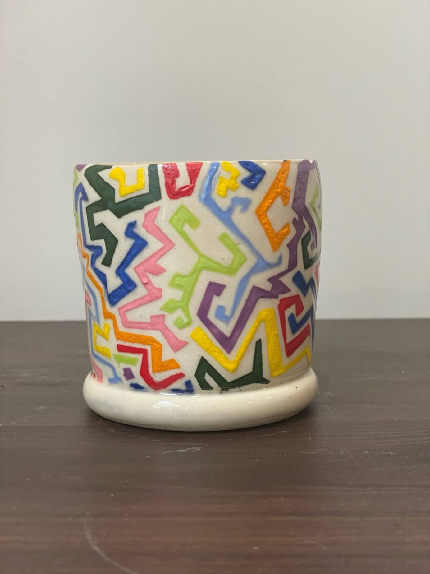 A small pot with a round base. For the glaze I created a zigzag shaped pattern on the computer, Used a cutting machine to cut out the pattern on vinyl and applied it to the pot. Then glazed it with various colored underglazes.