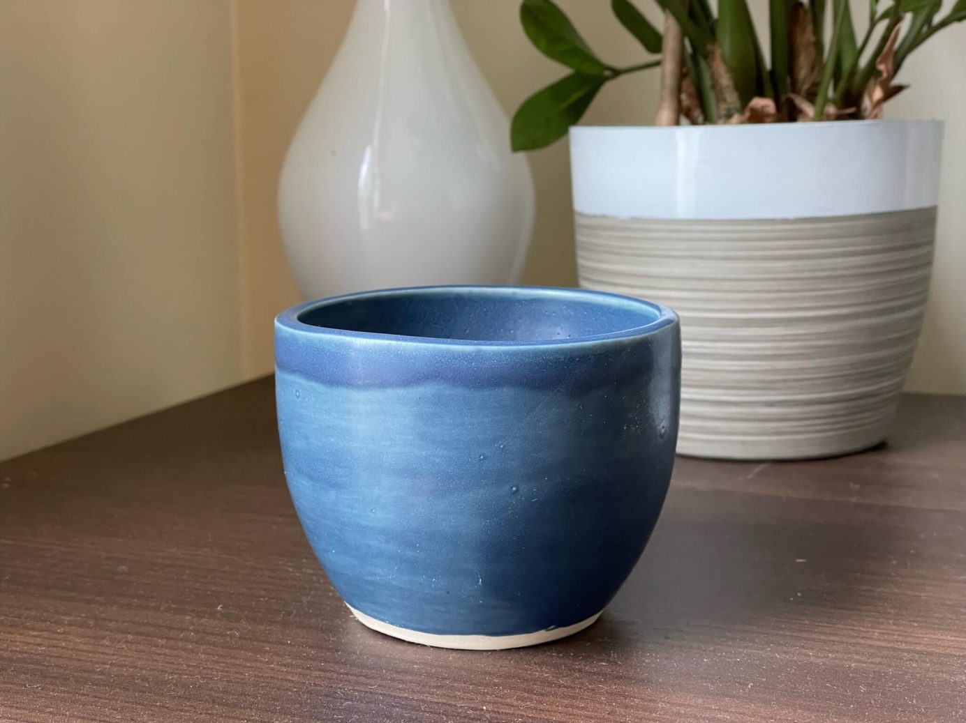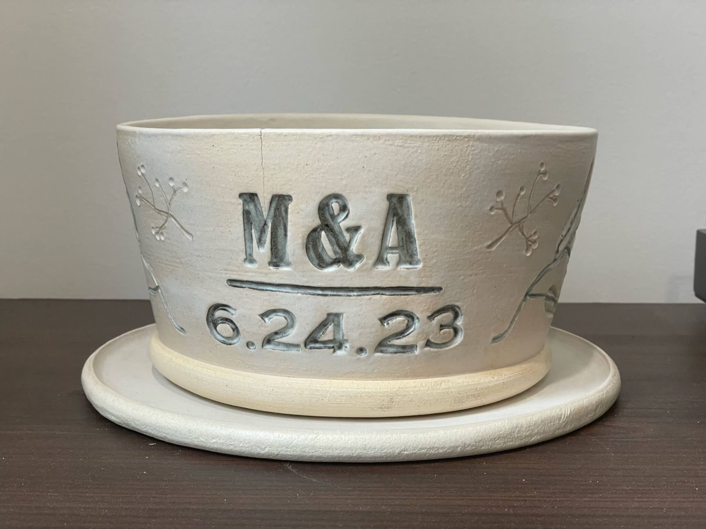 A large planter I threw as a wedding gift for a family member. It’s a large pot that I’m putting a plant in, and a water collection plate for below it. I carved out their initials and wedding date, as well as some plants going around the pot. Glazed with underglaze and a matte white over it.
