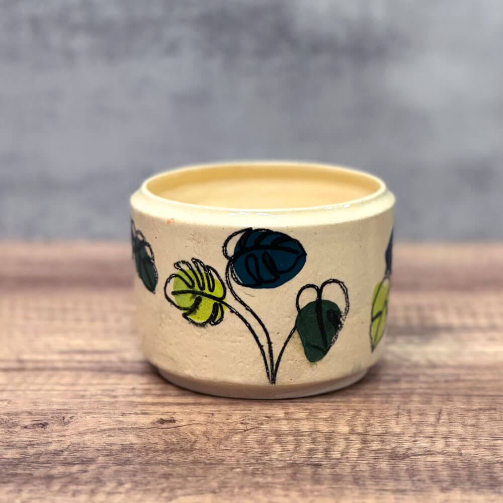 A wheel thrown brown stoneware planter I made, then used a vector pattern cut onto vinyl that I applied to the piece and glazed.