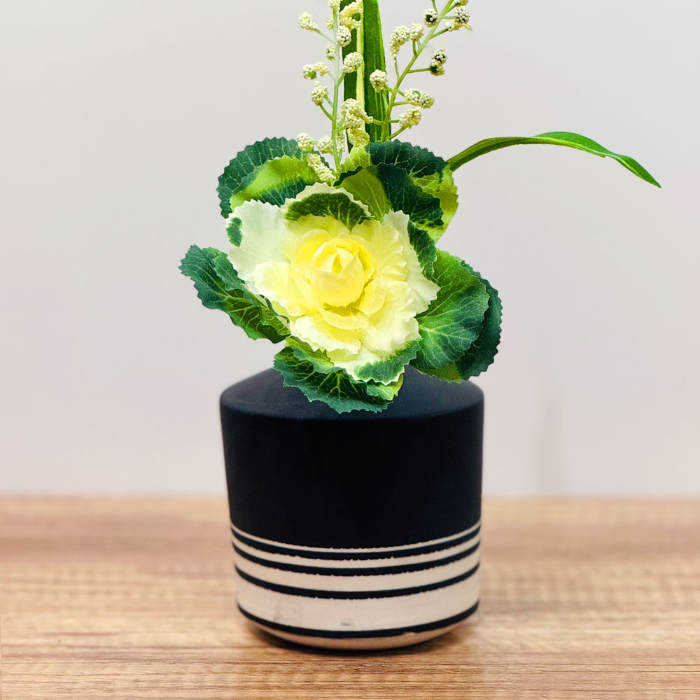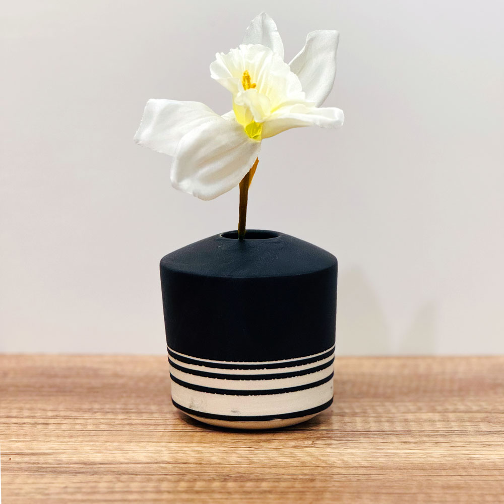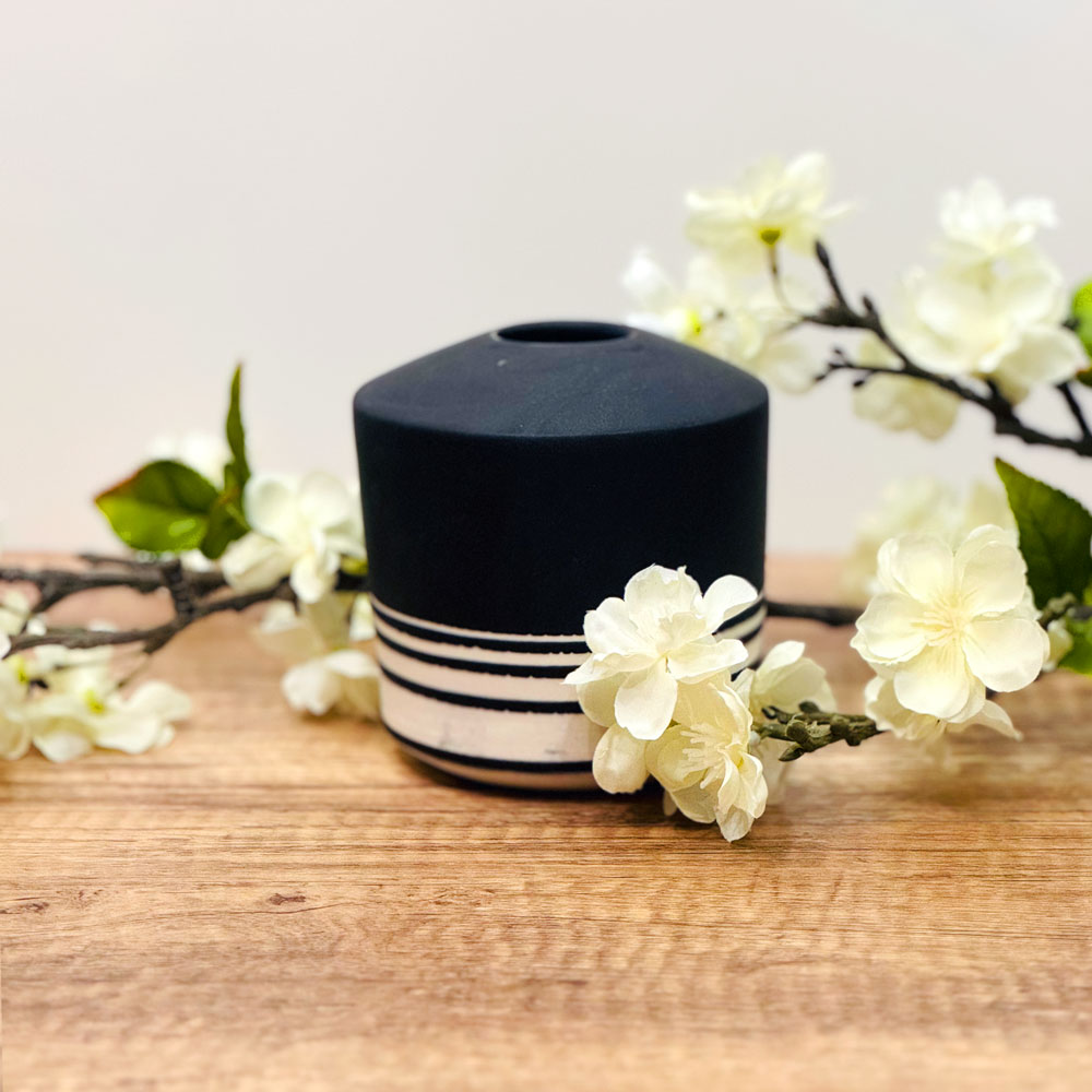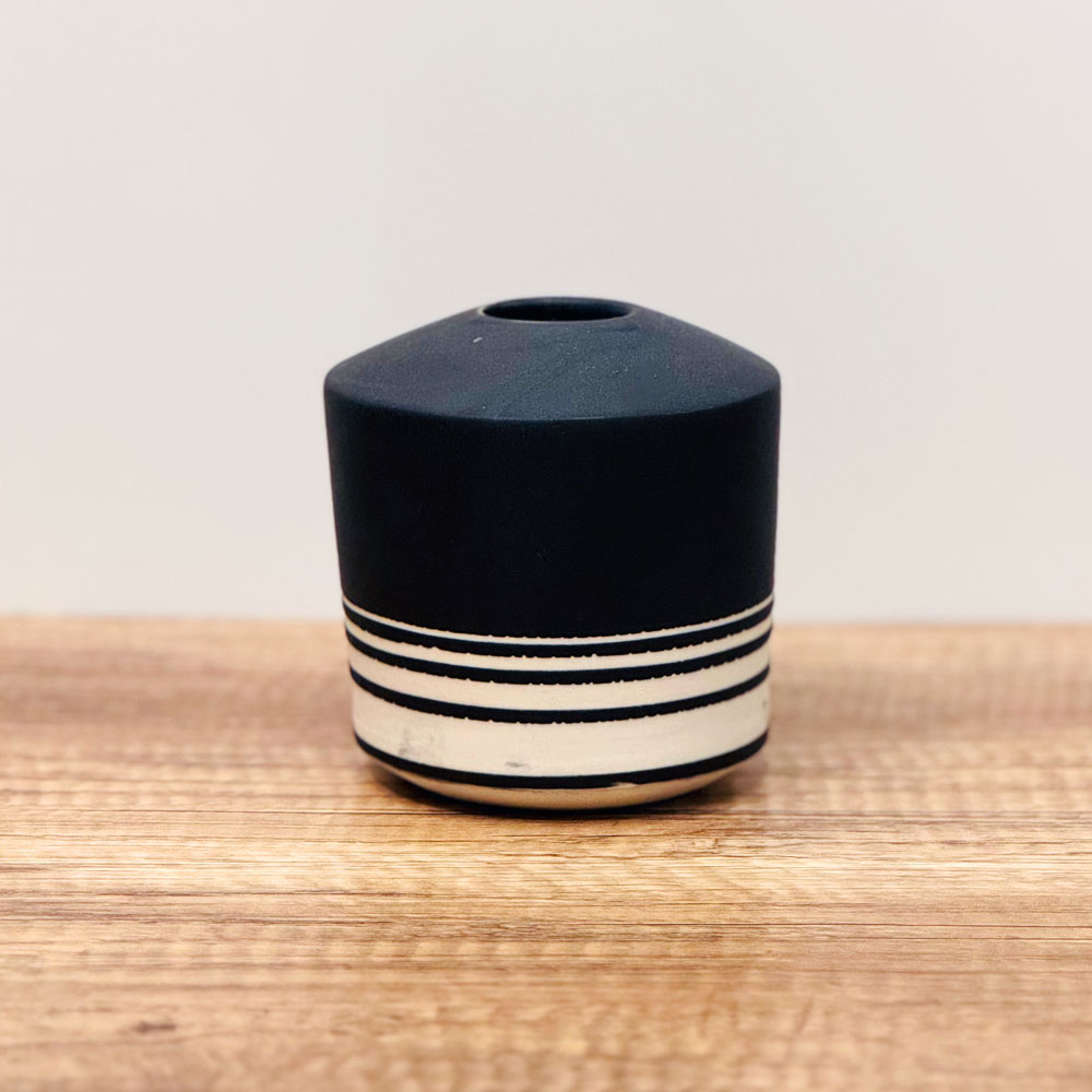 Black Fading Lines VaseSmall porcelain vase thrown on the wheel. Taped off sections of the pot and then dip glazed it.Share this piece:
