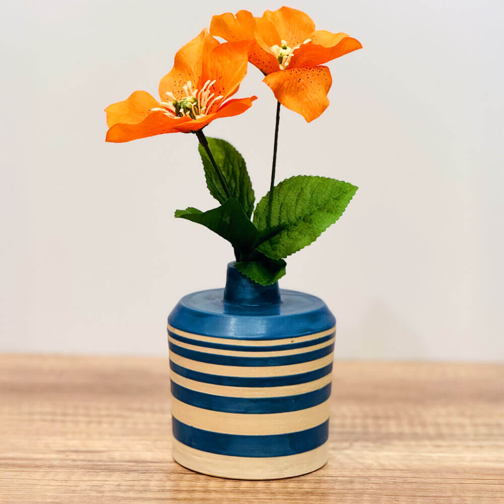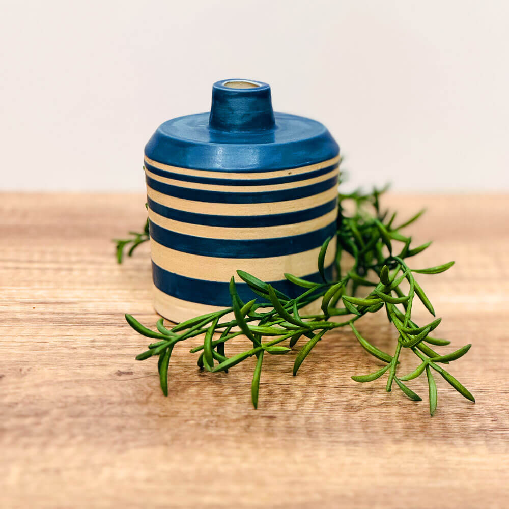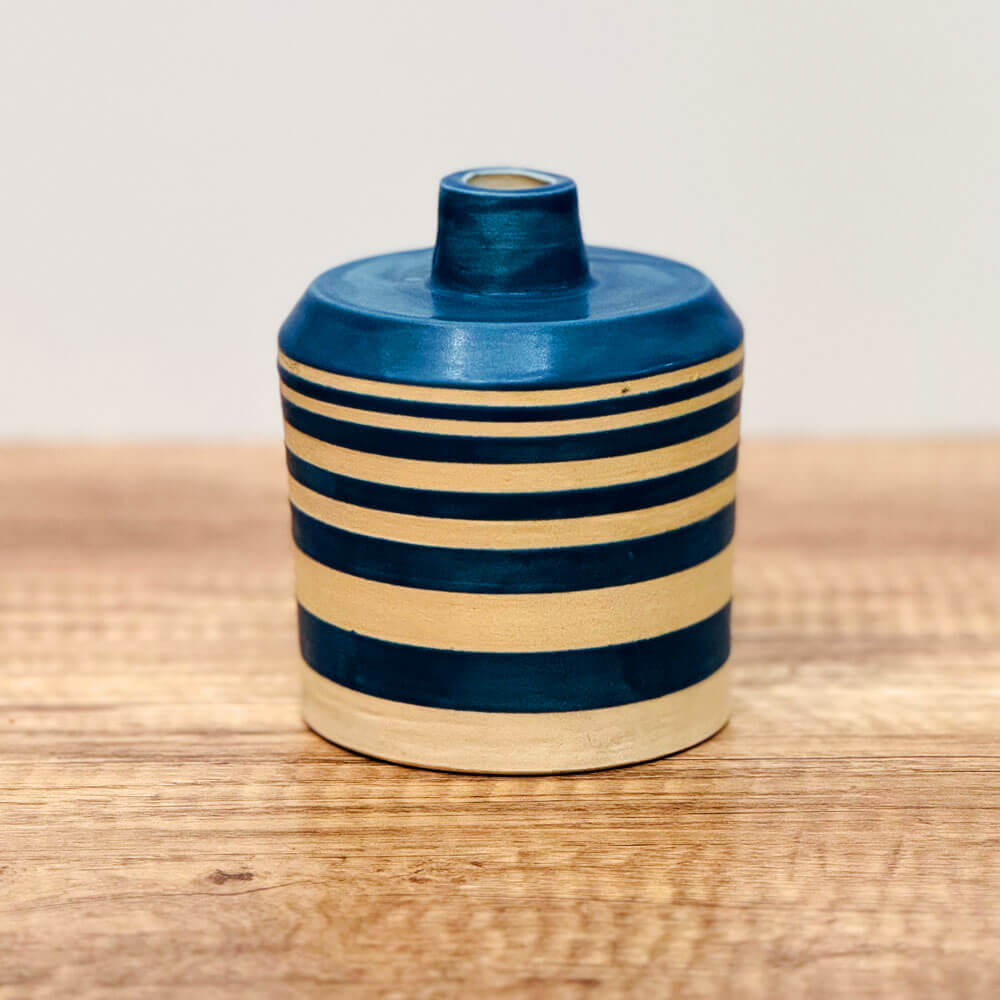 Fading Blue Lines VaseSmall porcelain vase thrown on the wheel. I taped the lines to create the effect and then brushed on matte glaze.Share this piece: